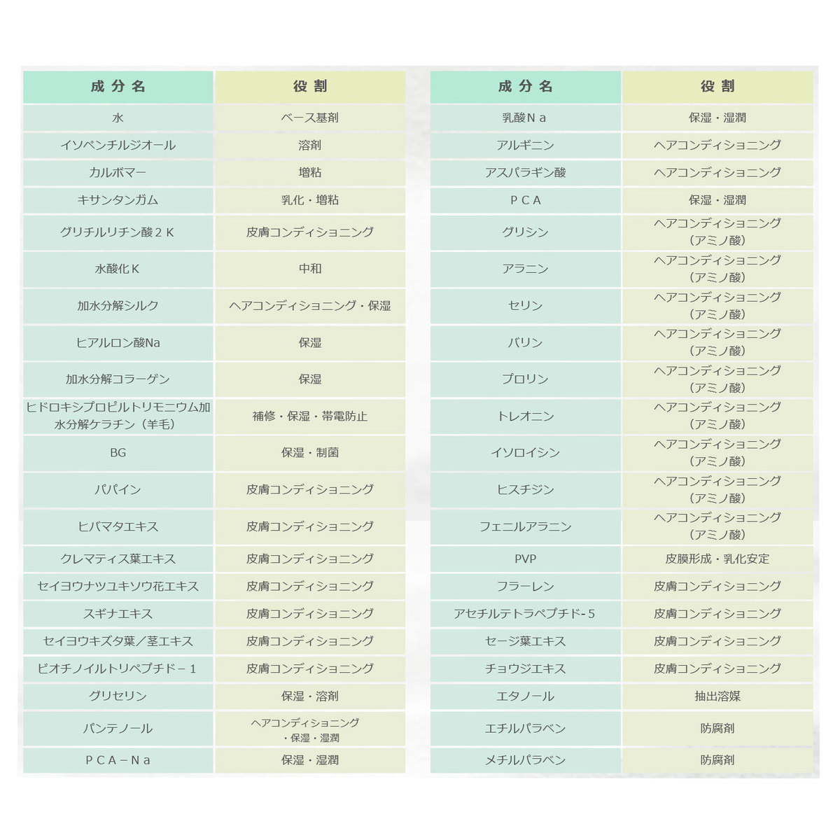 水、イソペンチルジオール、カルボマー、キサンタンガム、グリチルリチン酸2K、水酸化K、加水分解シルク、ヒアルロン酸Na、加水分解コラーゲン、ヒドロキシプロピルトリモニウム加水、分解ケラチン(羊毛)、BG、パパイン、ヒバマタエキス、クレマティス葉エキス、セイヨウナツユキソウ花エキス、スギナエキス、セイヨウキズタ葉/茎エキス、ビオチノイルトリペプチド-1、グリセリン、パンテノール、PCA-Na、乳酸Na、アルギニン、アスパラギン酸、PCA、グリシン、アラニン、セリン、バリン、プロリン、トレオニン、イソロイシン、ヒスチジン、フェニルアラニン、PVP、フラーレン、アセチルテトラペプチド‐5、セージ葉エキス、チョウジエキス、エタノール、エチルパラベン、メチルパラベン