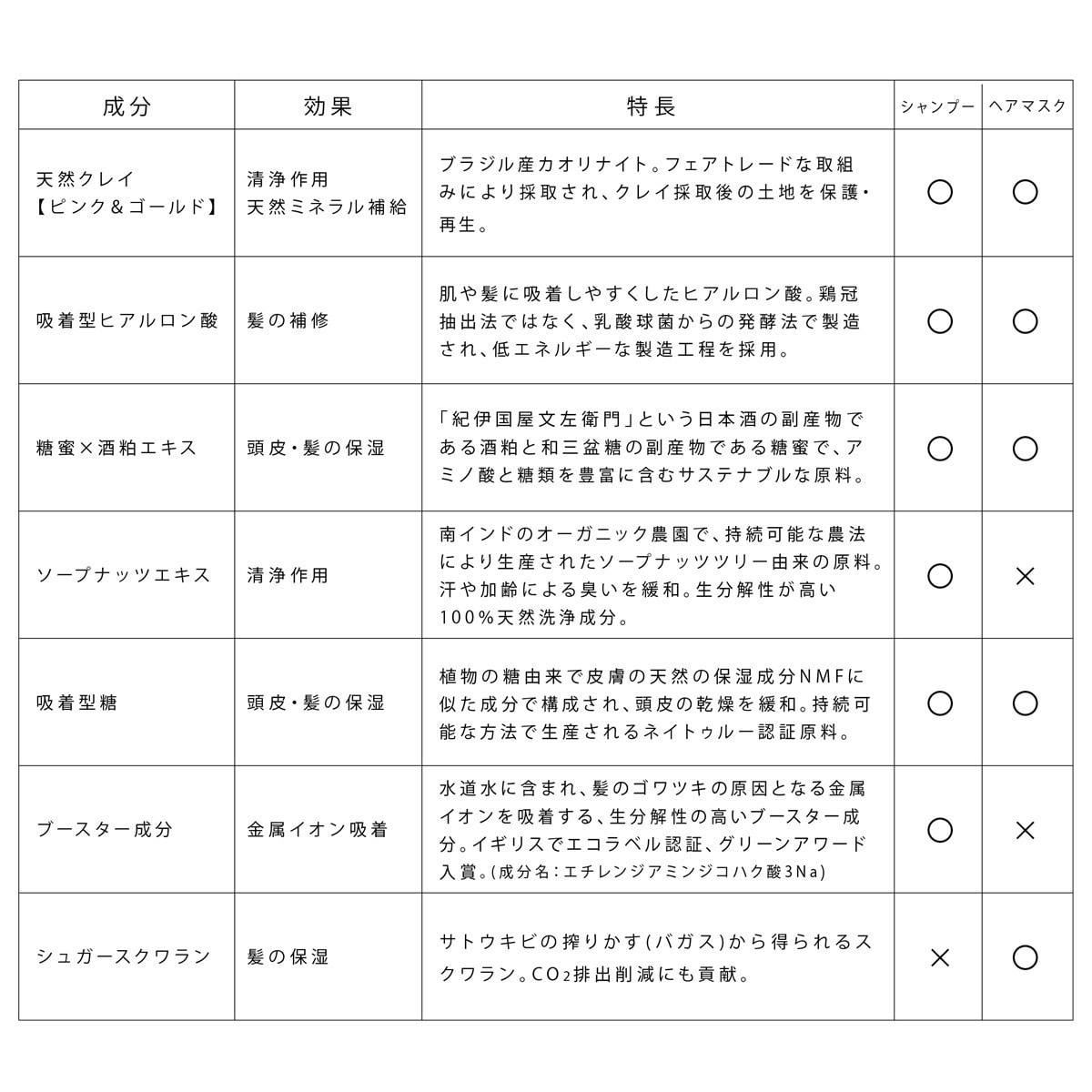 【シャンプー】水、コカミドプロピルベタイン、オレフィン(C14-16)スルホン酸Na、ラウロイルメチルアラニンNa、コカミドメチルMEA、グリセリン、カオリン、酒粕エキス、トウミツ、異性化糖、ヒアルロン酸ヒドロキシプロピルトリモニウム、サピンヅストリホリアツス果実エキス、エチレンジアミンジコハク酸3Na、塩化Na、ポリクオタニウム-10、クエン酸、デシルグルコシド、PEG-40水添ヒマシ油、PPG-14ポリグリセリル-2エーテル、EDTA-2Na、ラウロイルグルタミン酸ジヘキシルデシル、カラメル、酸化鉄、BG、安息香酸Na、フェノキシエタノール、香料