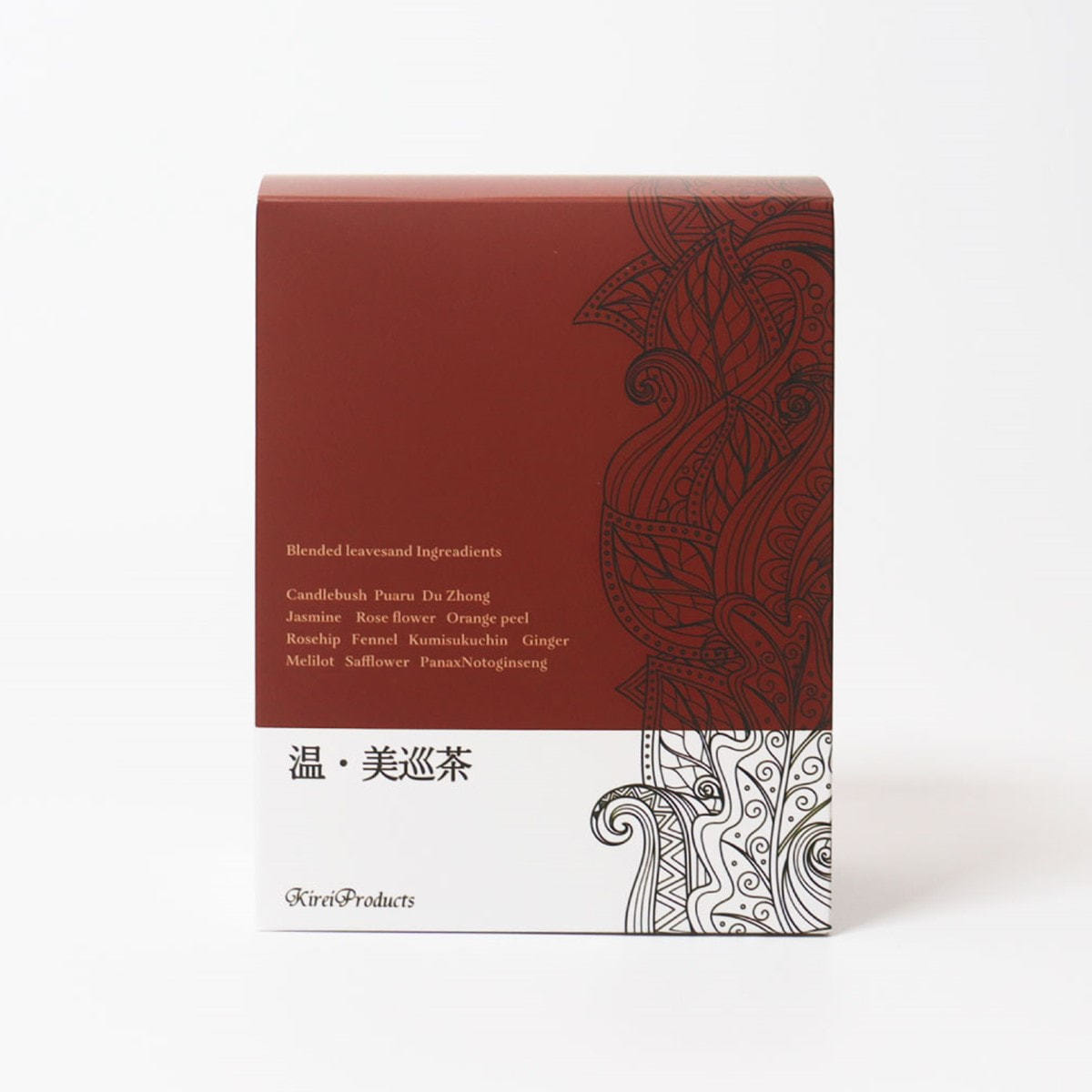 キャンドルブッシュ、プーアル、杜仲茶、ジャスミン茶、バラの花、みかんの皮、ローズヒップ、フェンネル、クミスクチン、生姜、メリロート、紅花、田七人参