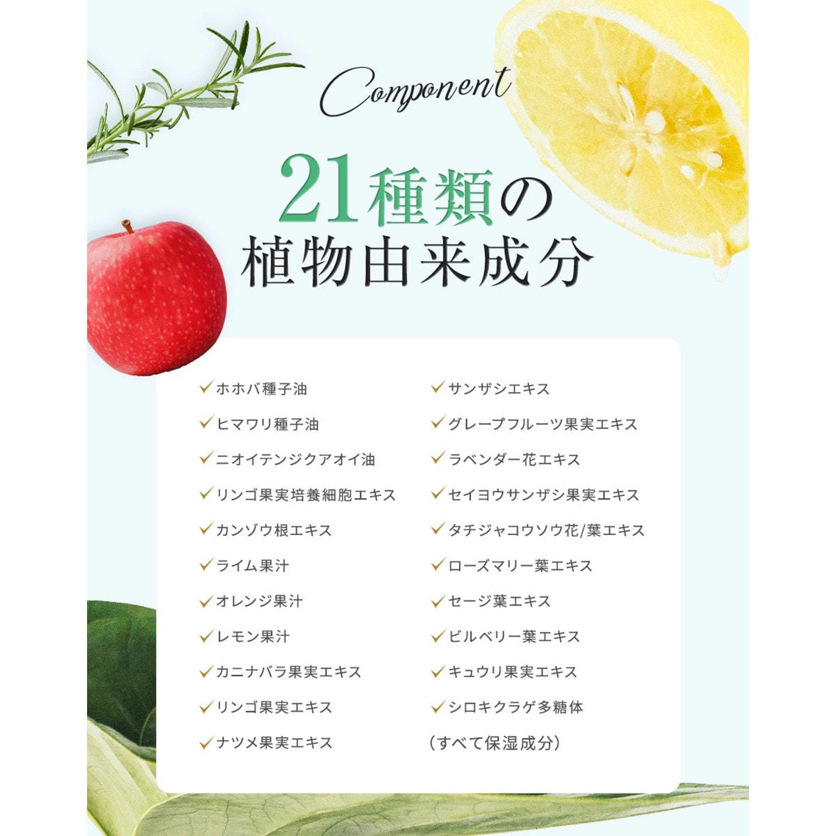 水、ココイル加水分解コラーゲンK、ラウロイルメチルアラニンNa、ココイルグリシンK、コカミドプロピルベタイン、コカミドDEA、スルホコハク酸(C12-14)パレス-2Na、プラセンタエキス、セテアラミドエチルジウトニウム加水分解コメタンパク、シロキクラゲ多糖体、ホホバ種子油、ヒマワリ種子油、ニオイテンジクアオイ油、リンゴ果実培養細胞エキス、カンゾウ根エキス、ライム果汁、オレンジ果汁、レモン果汁、カニナバラ果実エキス、リンゴ果実エキス、ナツメ果実エキス、サンザシエキス、グレープフルーツ果実エキス、ラベンダー花エキス、セイヨウサンザシ果実エキス、タチジャコウソウ花/葉エキス、ローズマリー葉エキス、セージ葉エキス、ビルベリー葉エキス、キュウリ果実エキス、トレハロースヒドロキシプロピルトリモニウムクロリド、レシチン、キサンタンガム、ポリクオタニウム-10、グリセリン、BG、DPG、クエン酸、ペンテト酸5Na、エタノール、フェノキシエタノール、メチルパラベン、香料