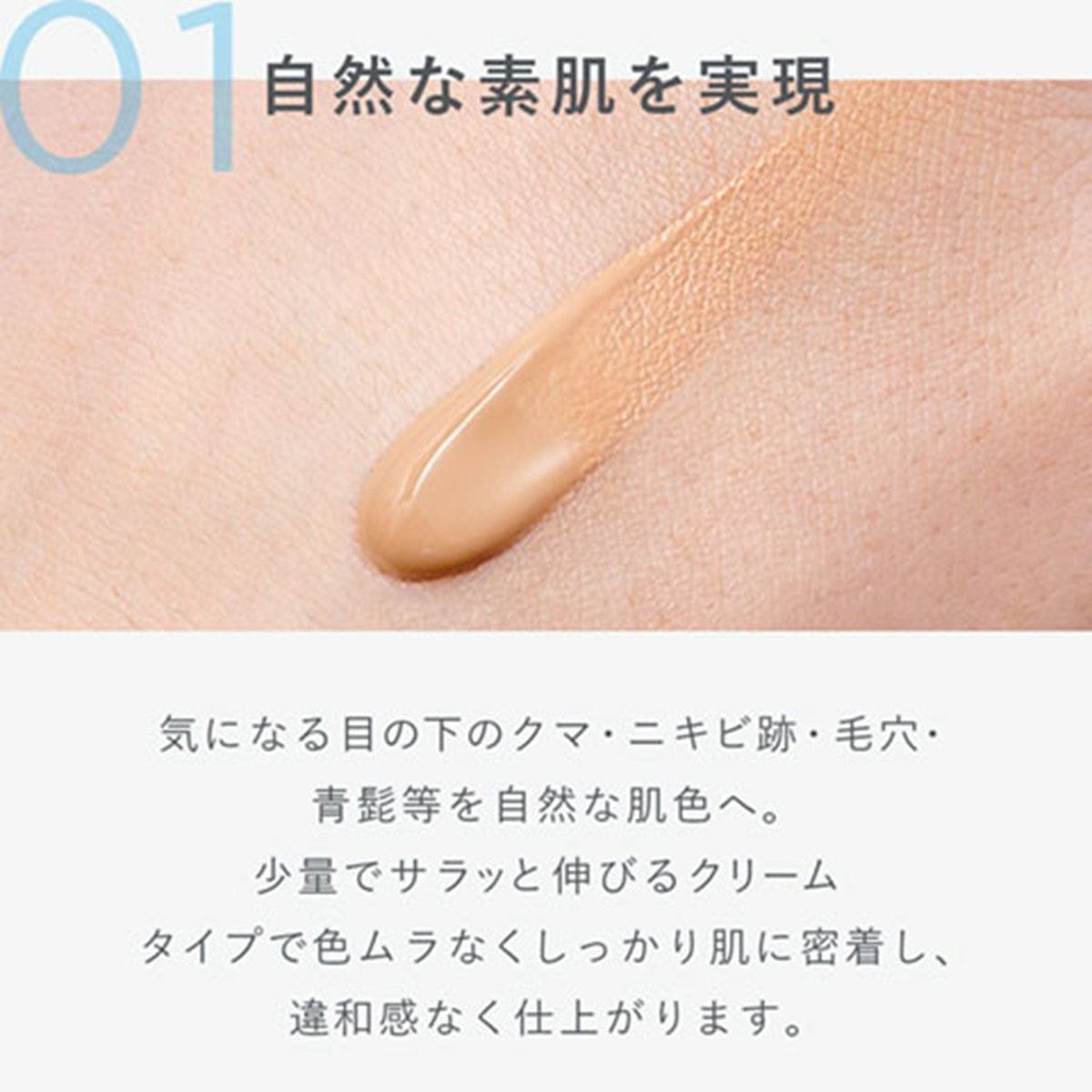 目の下のクマ、ニキビ跡、毛穴、青髭等の肌悩みを馴染みのよい“自然な肌色"でカバー。